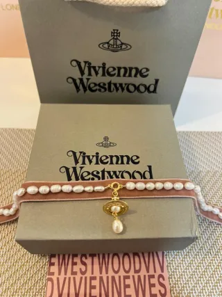 Elegante collar de Vivienne Westwood con un diseño delicado. - Cinta de terciopelo rosa. - Colgante con detalle dorado y perla. - Perlas incrustadas a lo largo de la cinta.