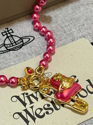 Elegante collar de la marca Vivienne Westwood con un diseño único. - Perlas de color rosa brillante. - Colgante con forma de corazón y imperdible en tono dorado. - Detalle de la marca en el colgante.