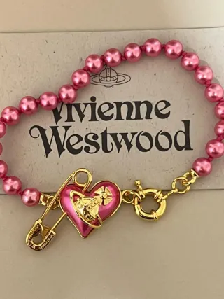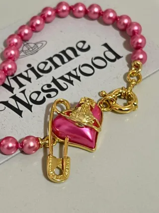 Elegante pulsera de la marca Vivienne Westwood con un diseño de corazón. - Perlas de color rosa. - Colgante de corazón esmaltado en rosa. - Detalle de un imperdible dorado. - Cierre de mosquetón dorado.