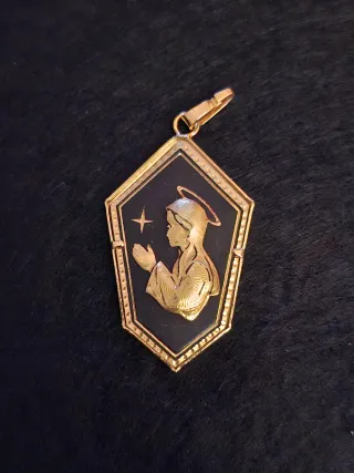 Preciosa medalla con diseño de damasquinado en oro. Representa una figura con halo y una estrella. - Detalle de la Virgen orando. - Marco con motivos decorativos. - Cierre para colgar.