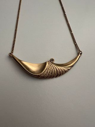 Elegante collar de oro con un diseño de colgante único. - Cadena fina y delicada. - Colgante con detalles texturizados y un pequeño brillante. - 14k, 14 gramos