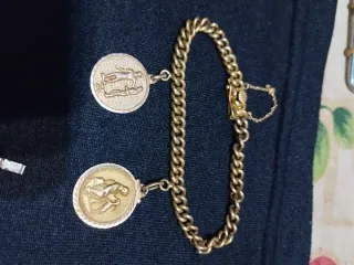 Elegante pulsera de oro de 18k con un diseño de cadena robusta y dos colgantes. Cierre de cajon - Peso: 32.82 gramos.