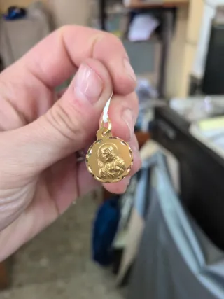 Precioso escapulario de oro con la imagen de la Macarena y la Sentencia. - Diseño circular. - Colgante con asa para cadena. 18 kilates Nuevo de joyería, se envía en su caja y con factura. Peso y medidas en fotos. Joyería padilla