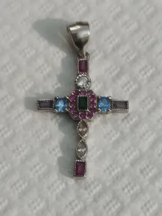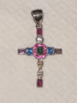 Elegante colgante en forma de cruz adornado con circonitas de diversos colores. - Diseño de cruz con múltiples gemas. - Montura de plata.