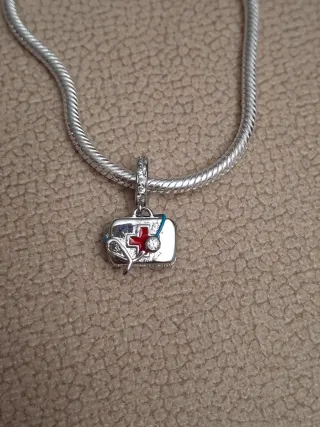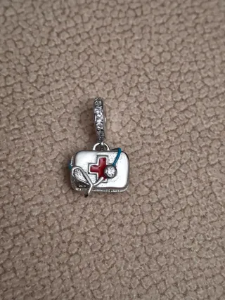 Este colgante tiene la forma de un botiquín médico con una cruz roja y un estetoscopio plateado. - Diseño de botiquín con detalles. - Cruz roja en el centro. - Estetoscopio plateado. - Aro para pulsera o collar.