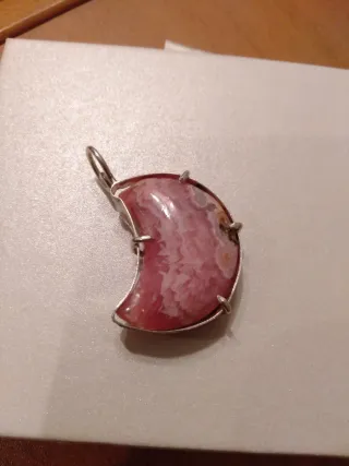 Colgante con forma de luna y piedra de rodocrosita engarzada en plata. - Diseño de luna. - Piedra natural de rodocrosita. - Engarce de plata. De mucha calidad.