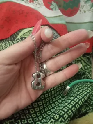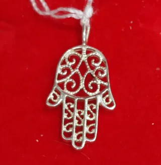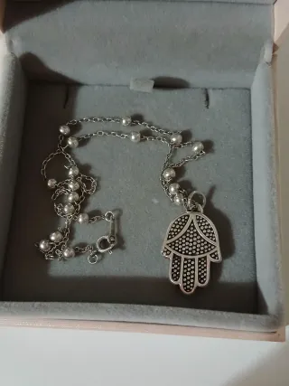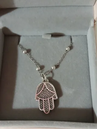 Usado 2 veces. Elegante collar con colgante de la Mano de Fátima. - Material: Plata de ley. - Diseño detallado con pequeños puntos. - Cadena fina con cuentas. No envio. Entrego en mano en Humanes de Madrid.