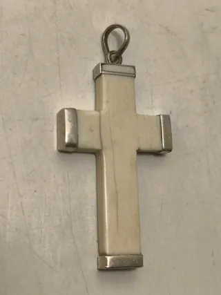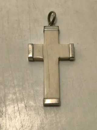 Elegante colgante con diseño de cruz, que combina la plata con un material de color marfil. - Diseño de cruz. - Detalles plateados. - Cierre para cadena. Es antigua aunque es nueva ya que nunca se ha utilizado para su propósito