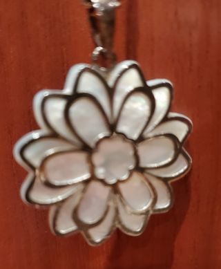 Elegante colgante con forma de flor, elaborado en plata y nácar. - Diseño delicado de pétalos. - Acabado brillante.