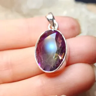 Colgante con piedra de amatista natural. - Diseño único con tonos morados y blancos. - Montura de metal plateado.