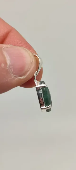 Colgante con una piedra engarzada que recuerda a una esmeralda. La montura es de plata. - Piedra de color verde intenso. - Montura de plata pulida.