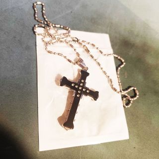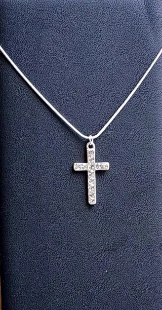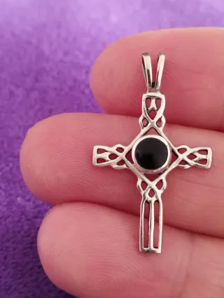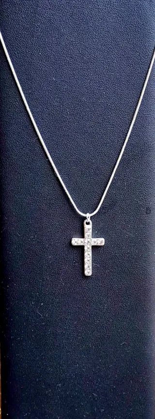 Elegante colgante con diseño de cruz, ideal para complementar tu estilo. - Acabado brillante en negro y plateado. - Detalles con pequeñas incrustaciones. - Incluye cadena.