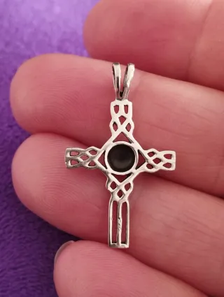 Colgante con diseño de cruz, combina un material claro con detalles metálicos. - Diseño de cruz. - Detalles plateados. - Cierre para cadena. Es antigua aunque es nueva ya que nunca se ha utilizado para su propósito