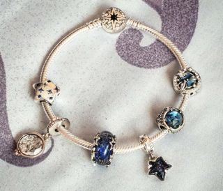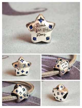 Conjunto de plata Estrellas y Galaxia compuesto por pulsera con charms y colgantes: - Charm Estrella con piedras azules y el grabado: Alcanza las estrellas. 10€. - Charm redondo de Cristal Azul. 10€. - Colgante Estrella doble disco. 12€. - Charm Luna y Estrella azul doble al reverso. 12€. - Colgante Estrella. 12€. - Charm Espacio. 10€. - Pulsera Estrella Polar de 19 cm de longitud. 18€. Precio unitario. Sólo envío. Si buscas algo y no lo encuentras pregúntame✍️🏼