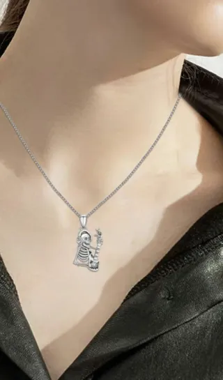 Colgante con diseño de calaveras en relieve. Un accesorio llamativo con un acabado plateado. Nuevo En su caja Acero inoxidable - Diseño de calaveras. - Acabado metálico.