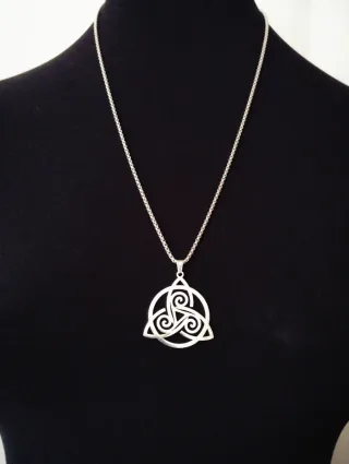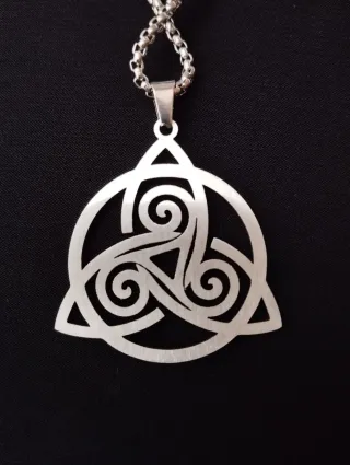 Combinación de dos símbolos Celtas, Trisquel dentro de una Triqueta, protegidos por un círculo. Nuevo, nunca usado. Todo en Acero Inoxidable Antialérgico, reverso en Acero Pulido liso. Cadena 60cms. Colgante 3cms. de diámetro No se pone feo, se puede mojar, no se oxida ni se deteriora. Unisex, para hombre o mujer. Más modelos de colgantes en mi perfil.