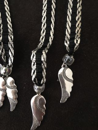 Lligacames artesanal con un diseño único. - Colgante con forma de alas. - Detalles en plata. - Cordón trenzado en negro y plata.