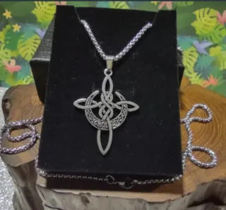 Joyería en acero. - Colgante de media luna. - Diseño: Cruz celta con luna. Nudo de bruja. Protección. - Material: Acero. - Hipoalergénico. - No cambia de color ni se oxida. - Hombre mujer unisex, - Medidas: Cadena de 60 cm. Colgante de 4.5 x 3 cm. ### Magia brujería ocultismo sortilegio encantamiento runas protección boda rockero moto Fashion hip hop bautizo fiesta Punk rock gótico motorista steampunk heavy metal Skull vikingo nórdico étnico bohemio wicca templario esotérico Runa oro plata titanio swarov