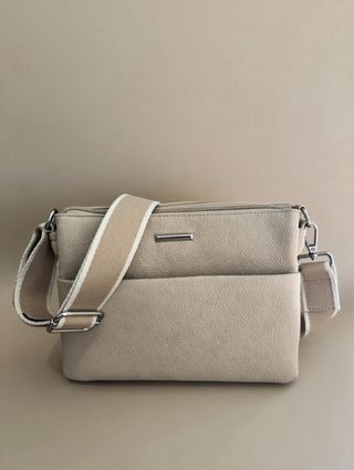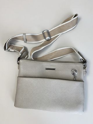 Bolso bandolera con un diseño moderno y práctico. - Correa ajustable con detalles en blanco y beige. - Compartimento principal con cierre de cremallera. - Bolsillo frontal adicional. - Detalle de colgante plateado.