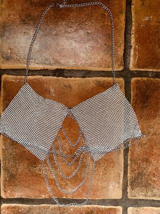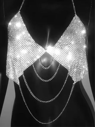 Este top es perfecto para añadir un toque de brillo a tu atuendo de fiesta. - Diseño de malla plateada. - Múltiples cadenas colgantes. - Cierre de cadena en el cuello y espalda. -Ideal para usar como sujetador con prendas muy amplias de sisa o escotes grandes