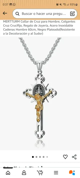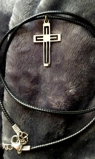 Colgante con diseño de cruz para hombre.El colgante es una cruz con un borde plateado y un centro negro, probablemente hecha de acero inoxidable y fibra de carbono. Estos materiales son comunes en la joyería masculina por su durabilidad y aspecto moderno. - Acabado en negro y plata. - Diseño moderno con líneas.