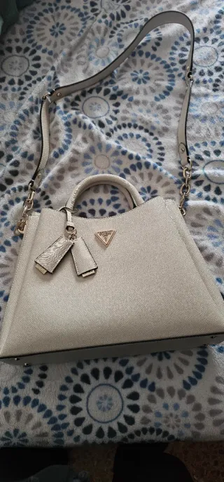 Elegante bolso de la marca Guess, con un acabado brillante que combina tonos plateados y blancos. Perfecto para añadir un toque de estilo a cualquier atuendo. - Diseño estructurado. - Asa superior. - Correa de hombro desmontable y ajustable. - Detalle de logo triangular metálico. - Dos colgantes decorativos.