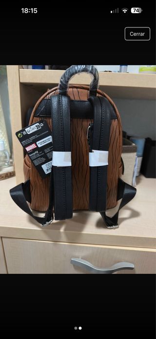 Mochila con diseño inspirado en Groot de Marvel. - Detalle de textura de madera. - Cremallera frontal con colgante de hoja. - Parche de Marvel Precio original 85€ La mini mochila está fabricada en cuero vegano (poliuretano). El bolso tiene correas ajustables para los hombros, bolsillos laterales y herrajes resistentes de color plateado. Las características adicionales incluyen apliques y detalles impresos. Esta mochila es un producto con licencia oficial de Marvel. Dimensiones de la mochila: 22,8 cm de ancho x 26,6 cm de alto x 11,4 cm de profundidad