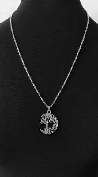 Combinación de dos símbolos Celtas, Luna Celta abrazando un Árbol de la Vida. Nuevo, nunca usado. Cadena de Acero Inoxidable Antialérgico, Colgante de metal plateado. No se pone feo, se puede mojar, no se oxida ni se deteriora. Anverso y reverso iguales. Unisex, para hombre o mujer. Para cualquier duda no dudes en preguntarme, respondo lo antes posible.