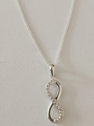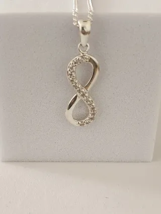 Elegante colgante con forma de infinito, adornado con circonitas cúbicas engastadas. - Diseño de infinito. - Baño de plata. - Circonitas cúbicas (CZ) engastadas.