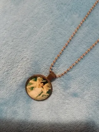 Colgante redondo con un diseño de cristal que muestra una mujer rodeada de ángeles. - Colgante con imagen de mujer y ángeles. - Montura plateada.