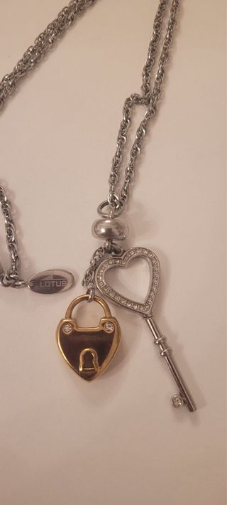 Elegante collar de la marca Lotus con un diseño de corazón y llave. - Colgante en forma de corazón con circonitas. - Colgante en forma de llave con circonitas. - Candado con detalle de circonita. - Cadena de eslabones plateada.