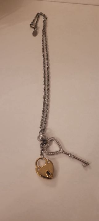 Conjunto de varias piezas de joyería para mujer. - Collar con colgante de corazón. - Colgante con forma de candado. - Cadena con dije. - Dije ovalado. - Dije con forma de llave.