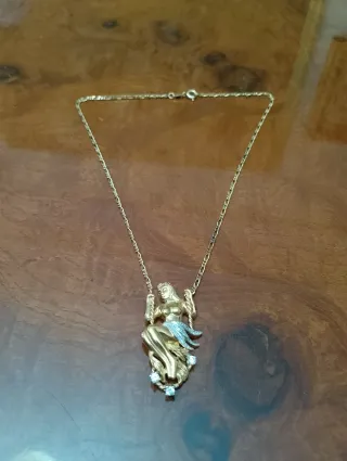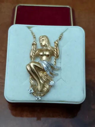 Colgante de plata de ley 925 y baño de oro con un diseño de una mujer en un columpio. - Plata de ley 925. - Diseño detallado.