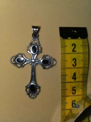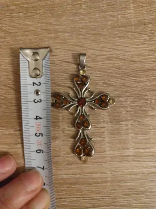 Elegante colgante con diseño de cruz adornado con piedras. - Diseño detallado con forma de cruz. - Incorpora piedras de tonalidades naranjas y detalles plateados. Al ser un objeto pequeño lo enviaría por correo ordinario si se me paga por adelantado sin recargo por el envío.