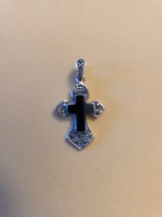 Elegante colgante en forma de cruz con detalles ornamentales y piedras negras - Fabricada en plata de ley 925. - Adornada con piedras de color negro.