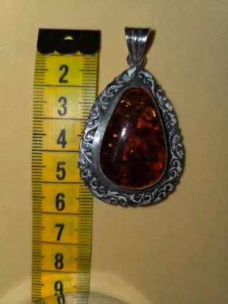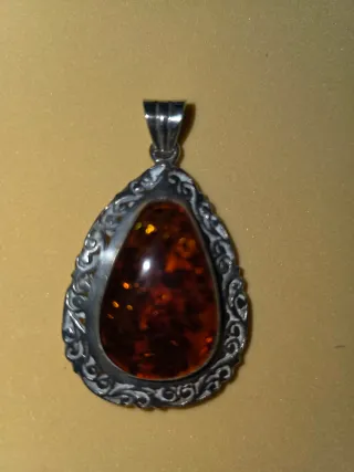 Elegante colgante de plata con una piedra de ámbar. - Diseño con detalles ornamentales. - Piedra de ámbar de color marrón intenso.