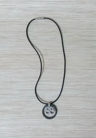 Elegante colgante con un diseño moderno y llamativo. Su acabado plateado le da un toque sofisticado. - Colgante de metal plateado. - Diseño ovalado con detalle interior. - Cuerda negra para colgar.