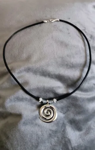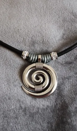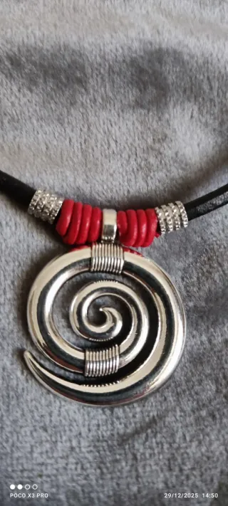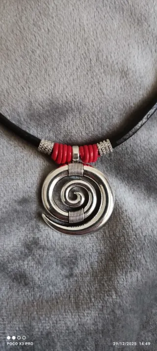Colgante con diseño de espiral, inspirado en la espiral de la vida. El cordón es negro y tiene detalles en rojo y plateado. - Colgante con forma de espiral. - Cordón negro. - Detalles decorativos en rojo y plateado.