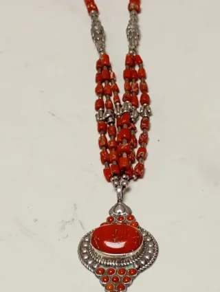 Collar artesanal , elaborado etnico. Combina la plata 925 con cuentas de coral natural. Collar 29×2 cm Colgante 7×4 cm 72 gr - Diseño con colgante central de coral. - Múltiples hilos de cuentas de coral y plata 925.