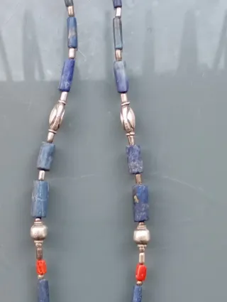Collar Berbère de Marueco con detalles en plata, hecho a mano 2×20 cm sin colgante. Colgante 6,5×4 cm - Peso: 52 gramos. - Elaborado con cuentas de lapislázuli y coral.