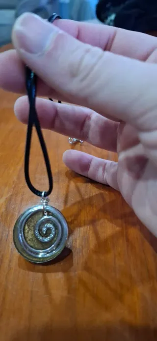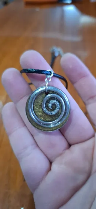Colgante con un diseño único en espiral. - Acabado en tonos dorados y plateados. - Cuerda negra para colgar.