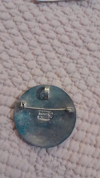 Elegante broche de plata con marcas con baño de oro y una circonita azul central. mide 3,5 cm de ancho 3,2 de largo contando las cadenitas. - Diseño con cadenas colgantes. - Detalles en circonitas pequeñas alrededor de la piedra principal.
