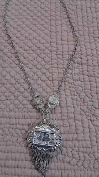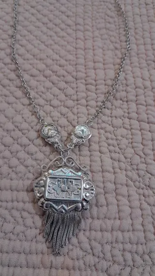 Elegante collar antiguo con un diseño detallado. - Elaborado en plata. - Colgante con detalles ornamentales. - Cadena fina.