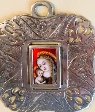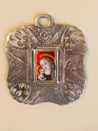 Preciosa medalla de plata con diseño detallado. - Representa a la Virgen con el Niño. - Borde ornamentado con querubines y motivos florales. - Incluye asa para colgar.