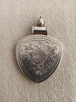 Colgante artesanal con un diseño único y elegante. - Elaborado en plata. - Incluye una piedra de lapislázuli. - Diseño ovalado con detalles ornamentales.