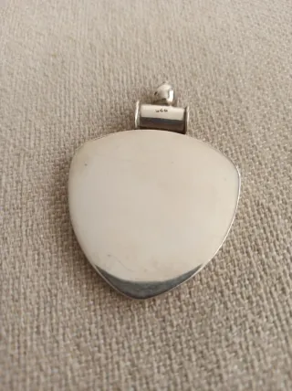 Precioso colgante artesanal con detalles en plata y nácar. - Diseño redondo y elegante. - Materiales de calidad.