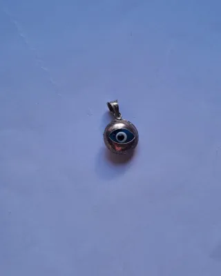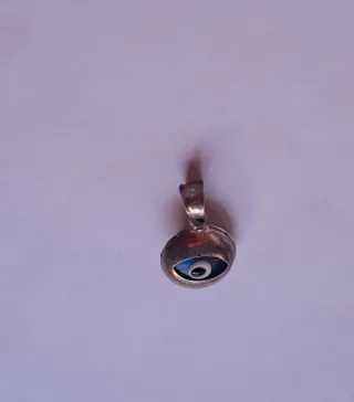 Colgante con diseño de ojo en plata. - Detalle en color azul. - Cierre para cadena.