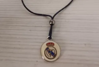Colgante con el escudo del Real Madrid. - Diseño circular con detalles en azul y plateado. - Incluye cordón negro ajustable.