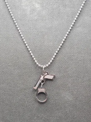 Colgante con diseño de pistola y esposas. - Fabricado en acero quirúrgico. - Acabado plateado.