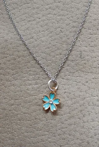 Collar con un delicado colgante de flor. - Colgante con esmalte azul y borde dorado. - Detalle de pequeña piedra en el centro. - Cadena de eslabones plateada.